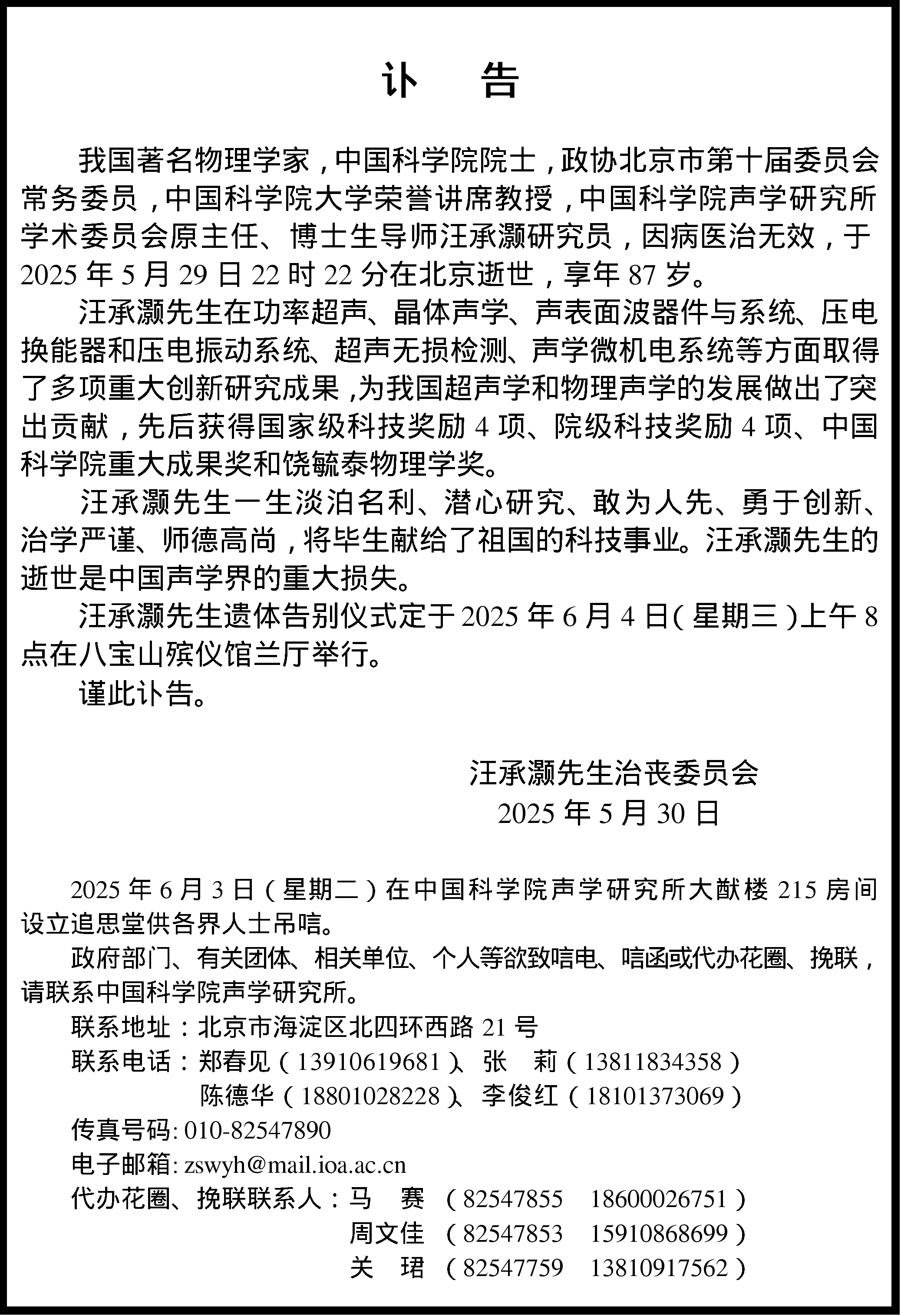 汪承灏院士讣告