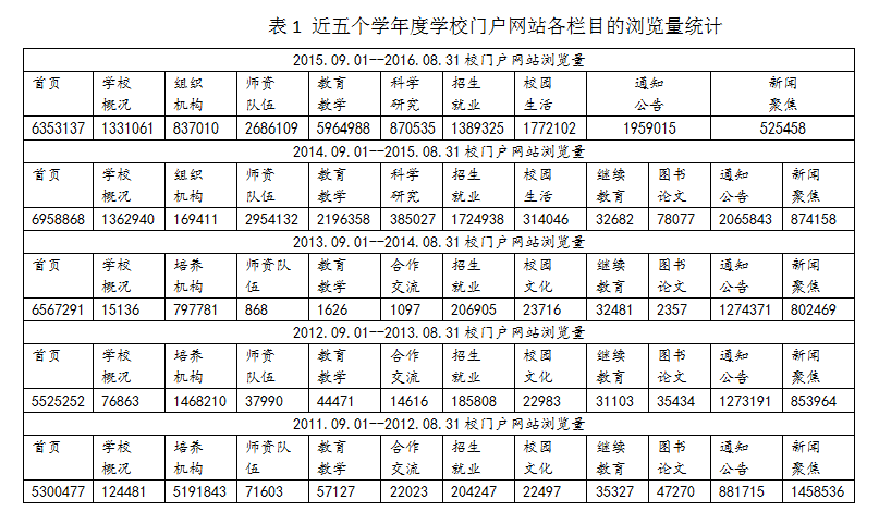 学校主页公开信息包括学校概况、组织机构、师资队伍、教育教学、科学研究、招生就业、校园生活、 通知公告、新闻聚焦、科苑学子、教学研究、校园活动、快速通道、光影凯发k8等栏目。2015-2016学年,学校门户网站访问量比上一年度增加461.7万人次,增长24.1%(表1)。组织机构、教育教学、科学研究、校园生活访问量均比去年有大幅度提升。